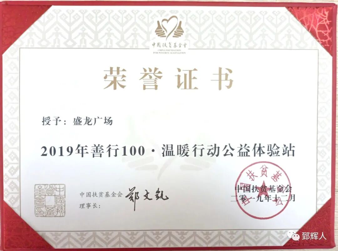 在中国扶贫基金会主办的《2019年善行100 • 温暖行动公益活动》中,盛龙购物中心被授予“2019年善行100 • 温暖行动公益体验站”荣誉牌匾。